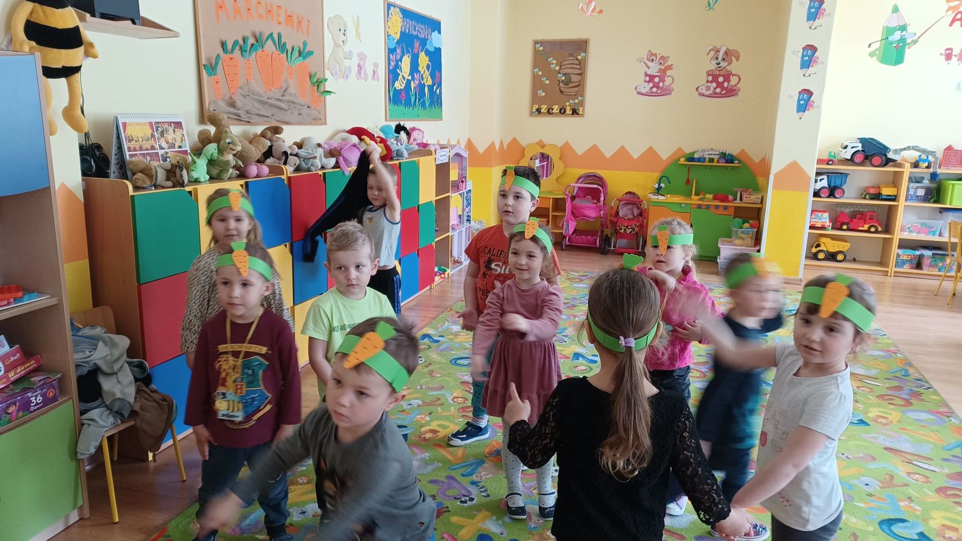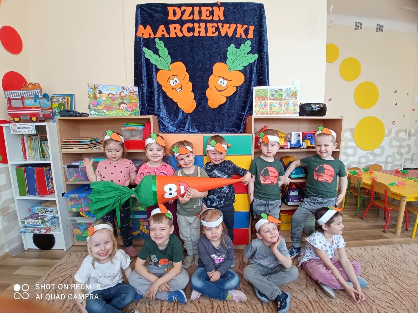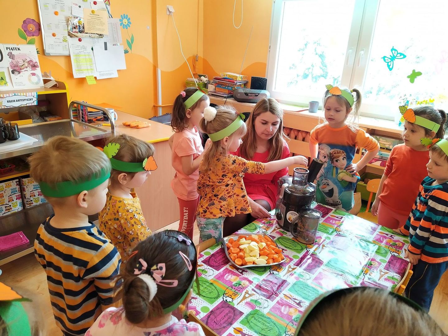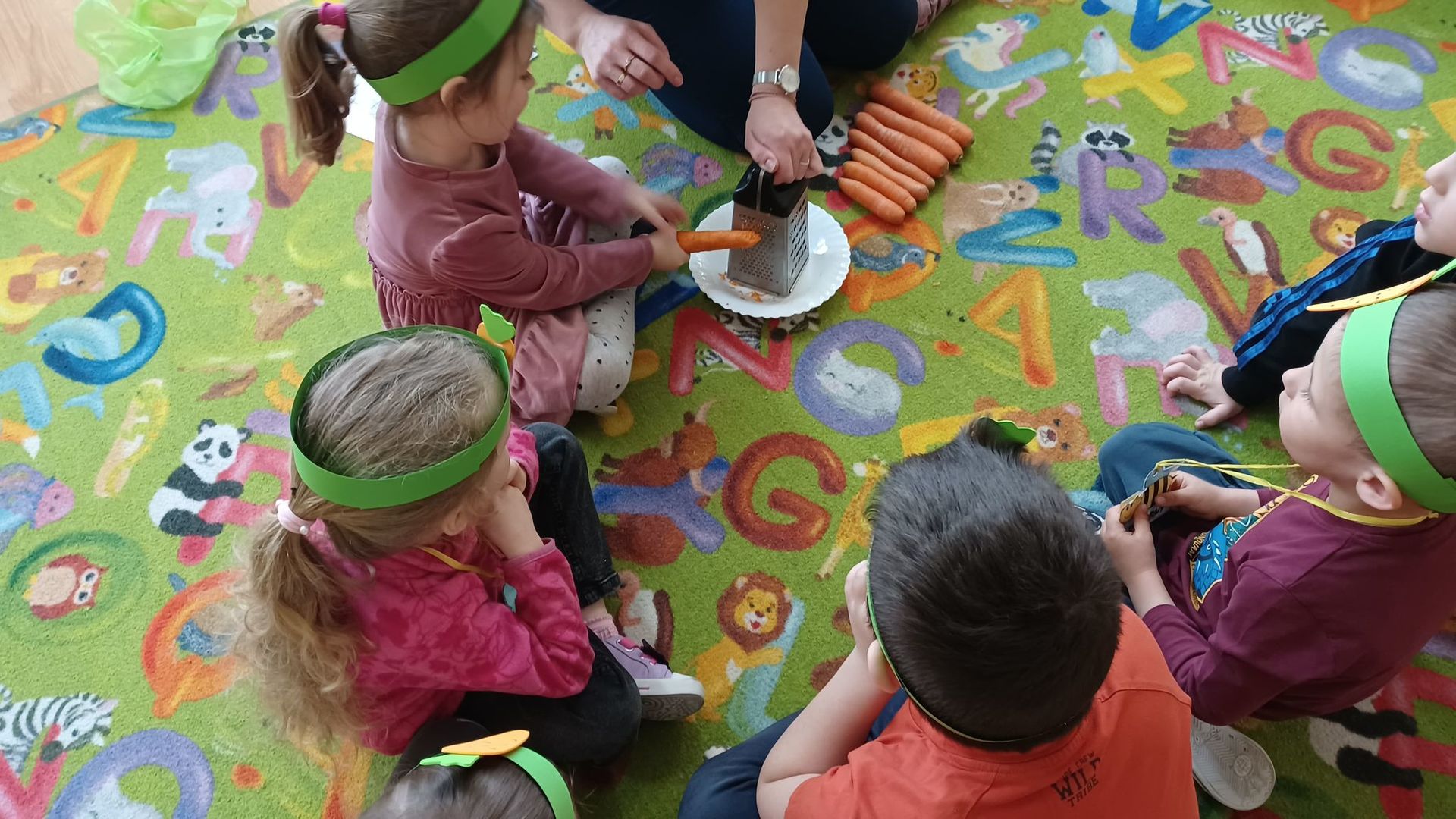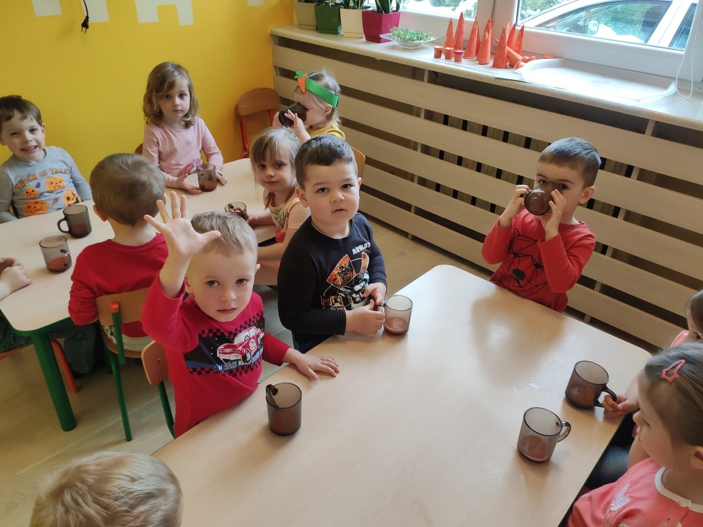 Dzień 04.04.2022r. był dniem wyjątkowo- pomarańczowym, marchewkowym, zdrowym i witaminowym. W tym dniu przedszkolaki poznały zalety i walory marchewki. Dzieci mogły się dowiedzieć wiele ciekawych rzeczy: jak bardzo jest zdrowa, zawiera wiele cennych witamin i składników odżywczych, korzystnie wpływa na skórę, włosy oraz wzrok. Warto pić także sok z marchwi, bo to witaminowa „bomba”. Ten dzień wypełniony był zabawami przy piosenkach o marchewce, pracami plastycznymi, chrupaniem surowych marchewek, próbowaniem marchewkowego soku a także degustacją marchewkowego ciasta. Dzięki takim działaniom prowadzonym już od najmłodszych lat, rozbudzamy u dzieci zainteresowanie własnym zdrowiem, potrzebę prawidłowego odżywiania się i rozróżniania produktów warunkujących zdrowie.