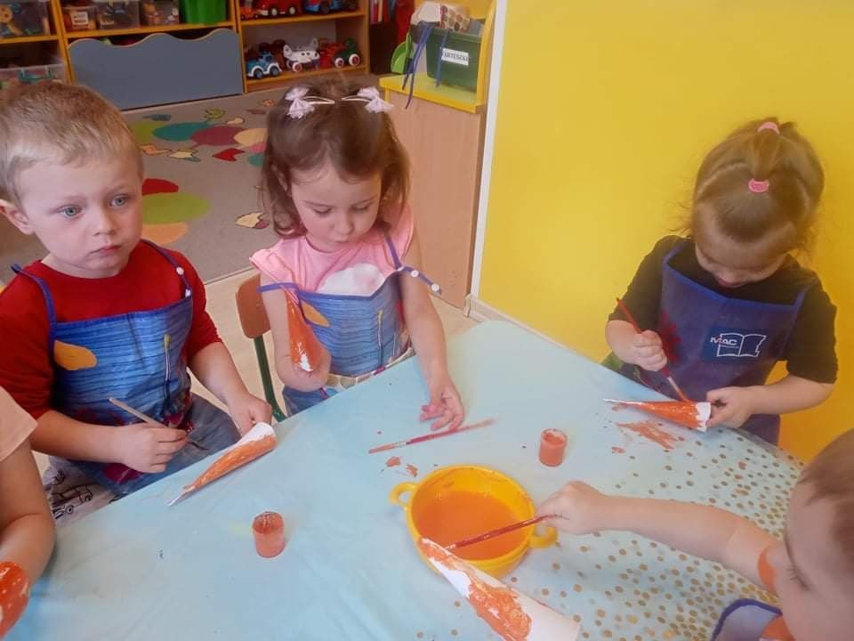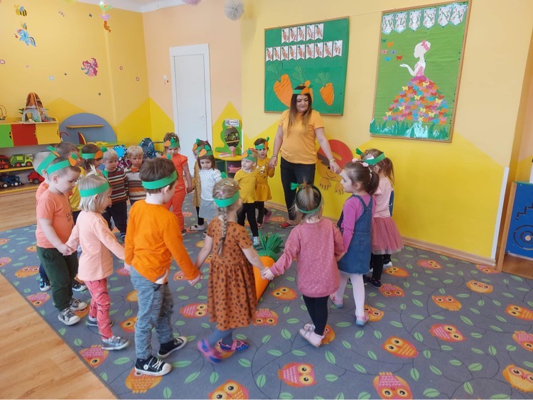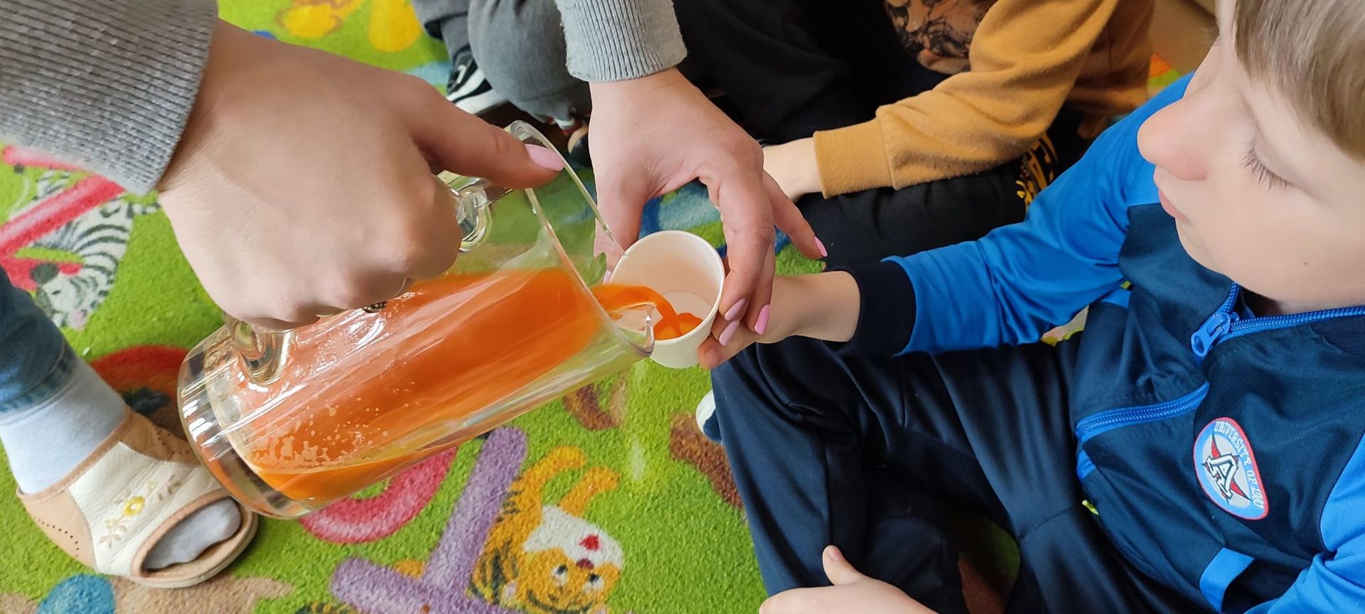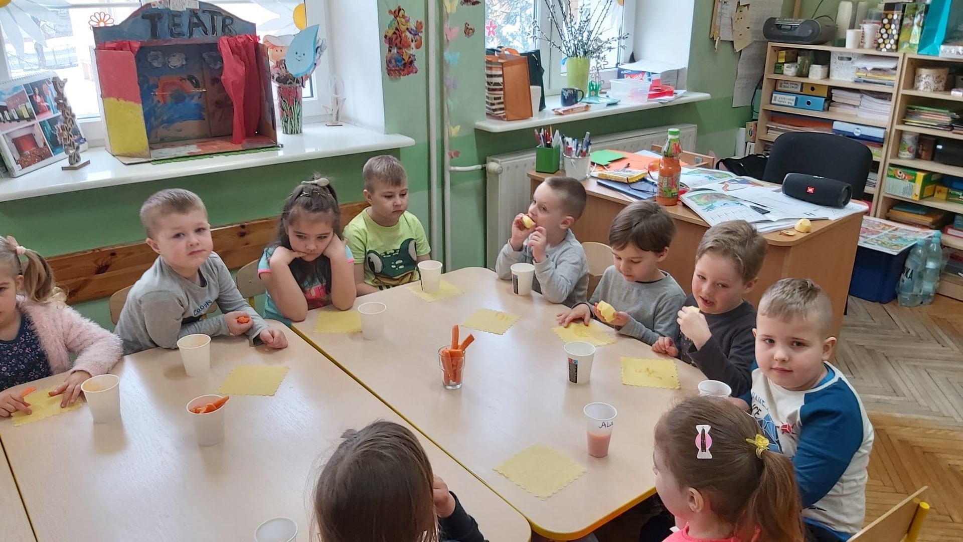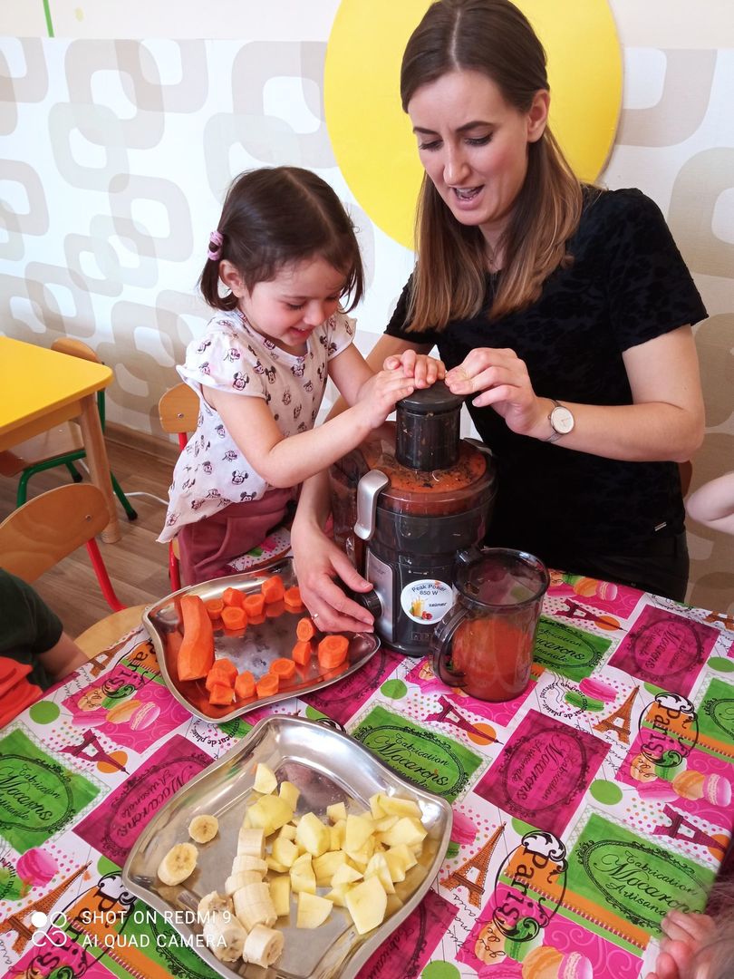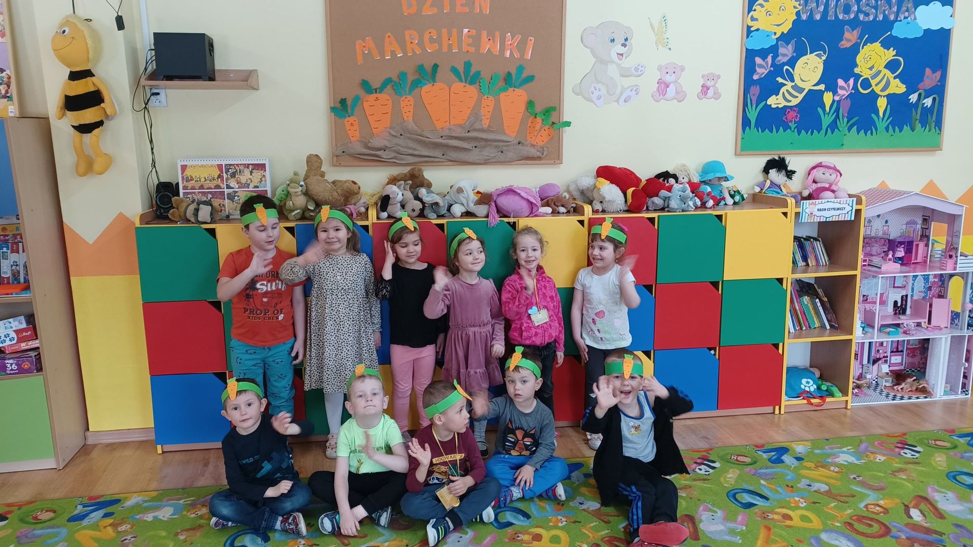 Dzień 04.04.2022r. był dniem wyjątkowo- pomarańczowym, marchewkowym, zdrowym i witaminowym. W tym dniu przedszkolaki poznały zalety i walory marchewki. Dzieci mogły się dowiedzieć wiele ciekawych rzeczy: jak bardzo jest zdrowa, zawiera wiele cennych witamin i składników odżywczych, korzystnie wpływa na skórę, włosy oraz wzrok. Warto pić także sok z marchwi, bo to witaminowa „bomba”. Ten dzień wypełniony był zabawami przy piosenkach o marchewce, pracami plastycznymi, chrupaniem surowych marchewek, próbowaniem marchewkowego soku a także degustacją marchewkowego ciasta. Dzięki takim działaniom prowadzonym już od najmłodszych lat, rozbudzamy u dzieci zainteresowanie własnym zdrowiem, potrzebę prawidłowego odżywiania się i rozróżniania produktów warunkujących zdrowie.