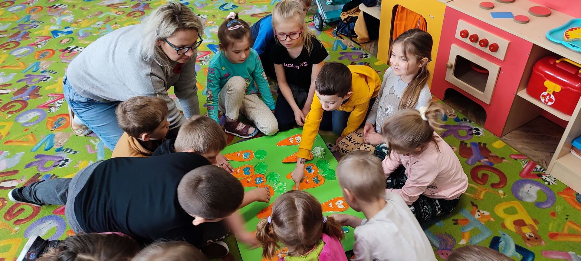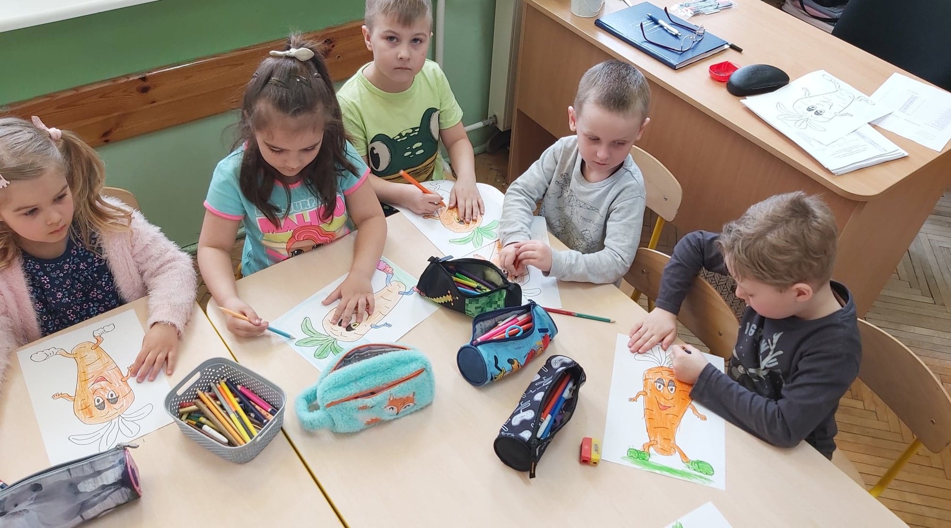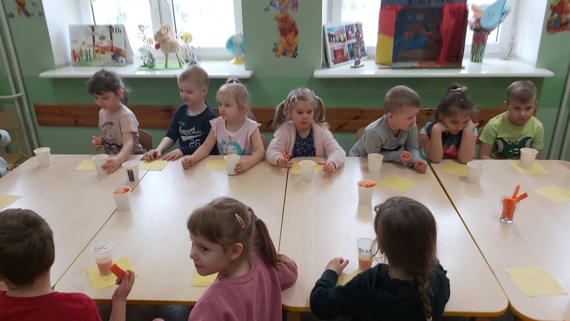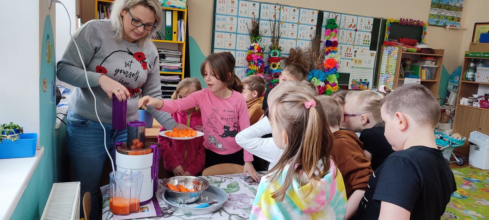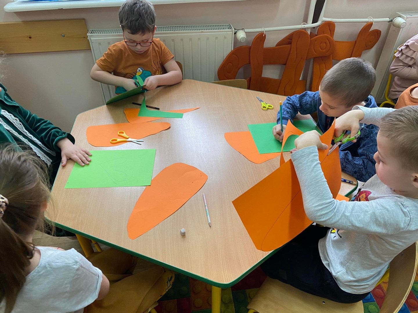 Dzień 04.04.2022r. był dniem wyjątkowo- pomarańczowym, marchewkowym, zdrowym i witaminowym. W tym dniu przedszkolaki poznały zalety i walory marchewki. Dzieci mogły się dowiedzieć wiele ciekawych rzeczy: jak bardzo jest zdrowa, zawiera wiele cennych witamin i składników odżywczych, korzystnie wpływa na skórę, włosy oraz wzrok. Warto pić także sok z marchwi, bo to witaminowa „bomba”. Ten dzień wypełniony był zabawami przy piosenkach o marchewce, pracami plastycznymi, chrupaniem surowych marchewek, próbowaniem marchewkowego soku a także degustacją marchewkowego ciasta. Dzięki takim działaniom prowadzonym już od najmłodszych lat, rozbudzamy u dzieci zainteresowanie własnym zdrowiem, potrzebę prawidłowego odżywiania się i rozróżniania produktów warunkujących zdrowie.