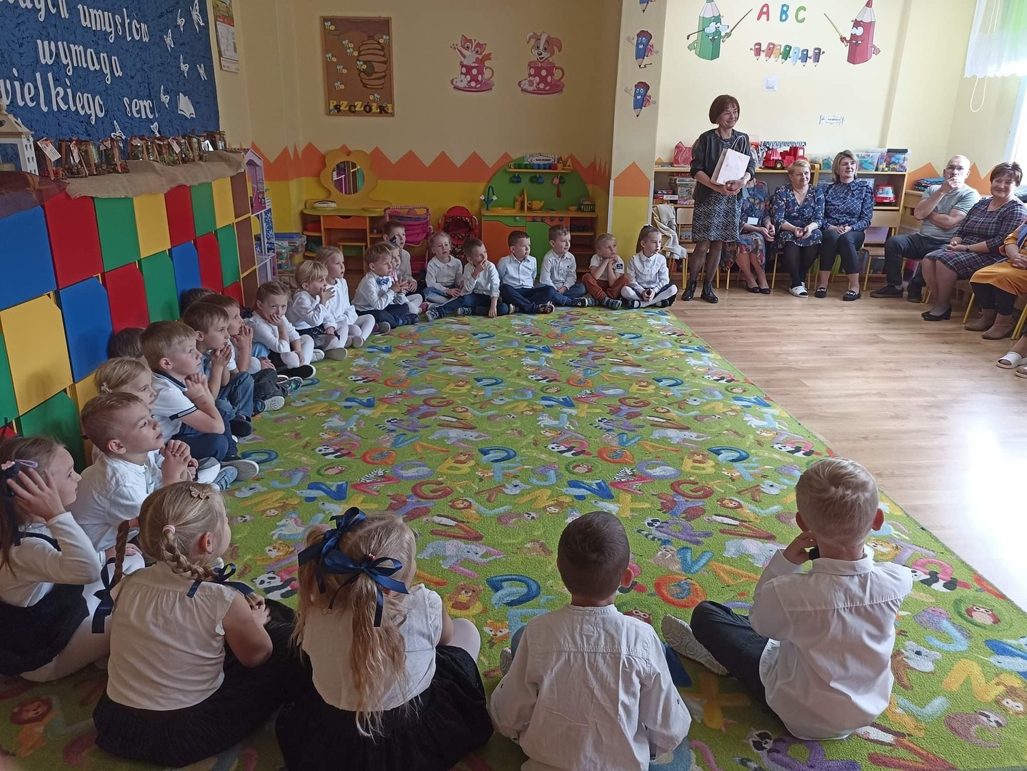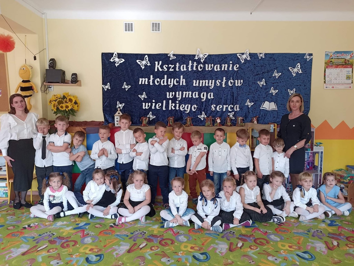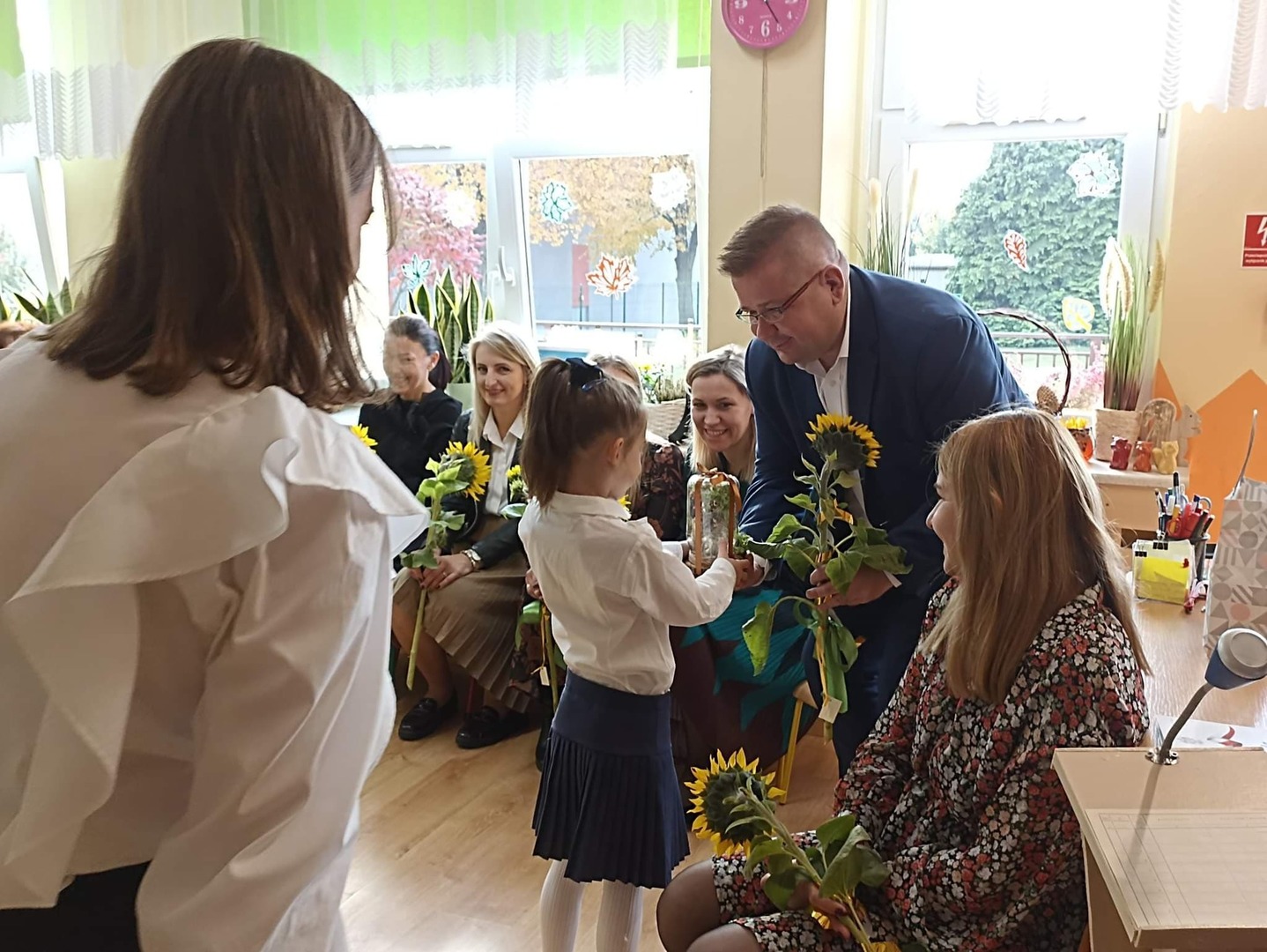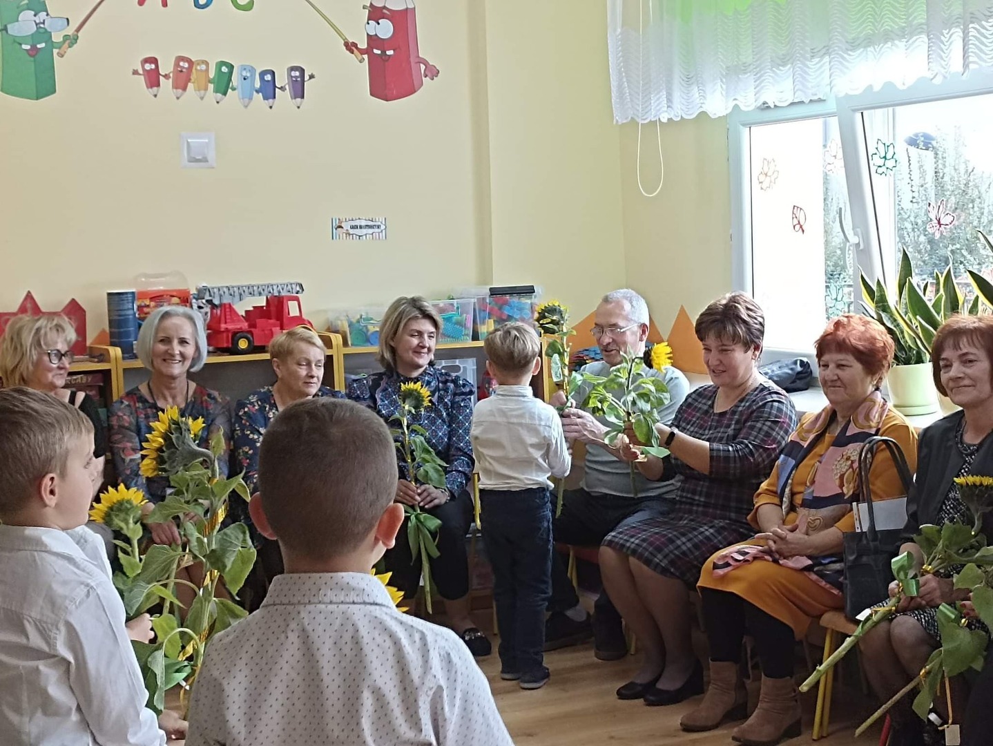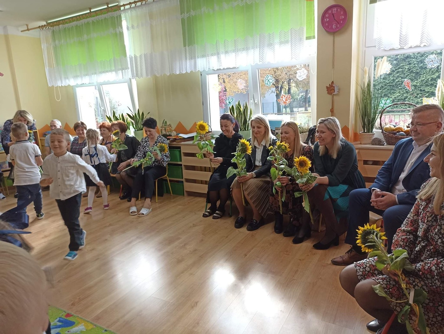 Jak co roku w naszym przedszkolu, 14 października świętowaliśmy Dzień Edukacji Narodowej. Z tej okazji gościliśmy w naszych progach emerytów pracujących kiedyś w naszej placówce. Pani Dyrektor serdecznie przywitała przybyłych gości: emerytów, Pana Burmistrza, nauczycieli oraz wszystkich pracowników przedszkola. Następnie przybyli goście mieli okazję obejrzeć i wysłuchać skecz słowno – taneczny w wykonaniu grupy „Pszczółki”. Mali artyści wykazali się znajomością swoich tekstów i przydzielonych ról w które się wcielili. Można było zauważyć małe talenty aktorskie oraz wyłonić przyszłych lektorów. Goście z uśmiechem na twarzy wysłuchali wierszyków, a gdy dzieci zaczęły tańczyć do piosenki „ Parasolki” M. Koterbskiej niektórym popłynęła łezka ze wzruszenia. Na zakończenie dzieci wręczyły upominki emerytom, Panu Burmistrzowi oraz słoneczniki wszystkim przybyłym gościom. Był to bardzo miło spędzony czas.