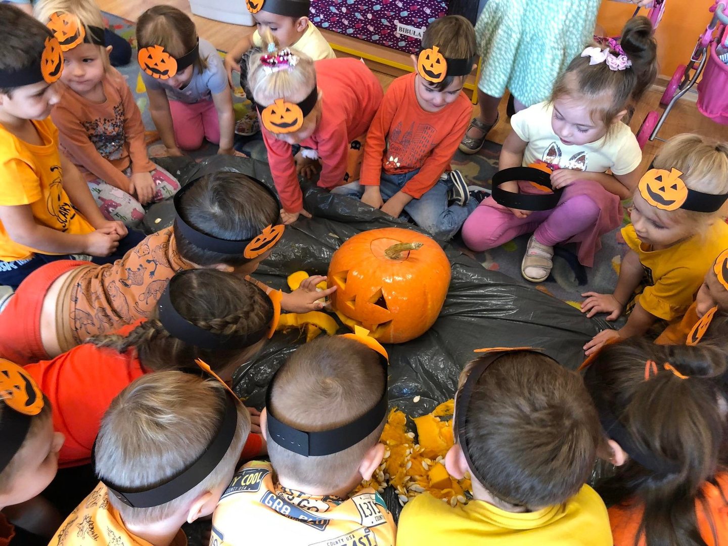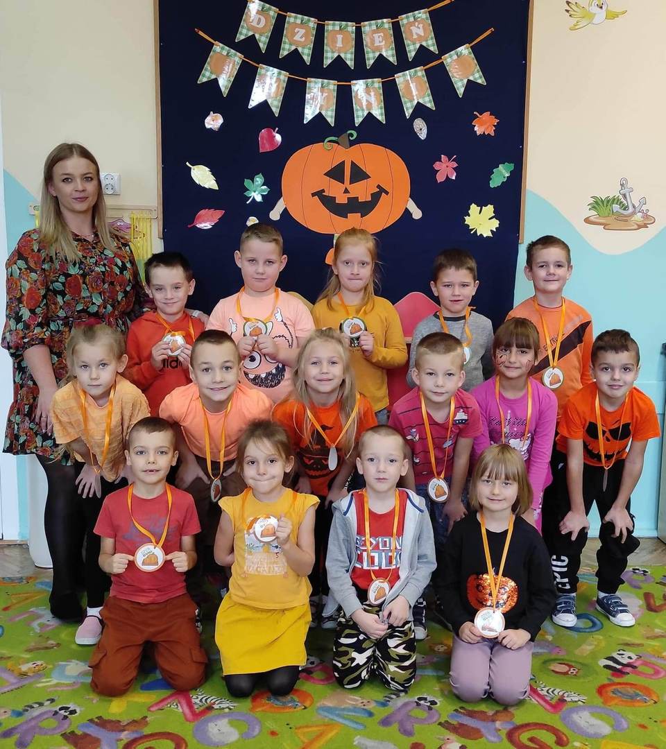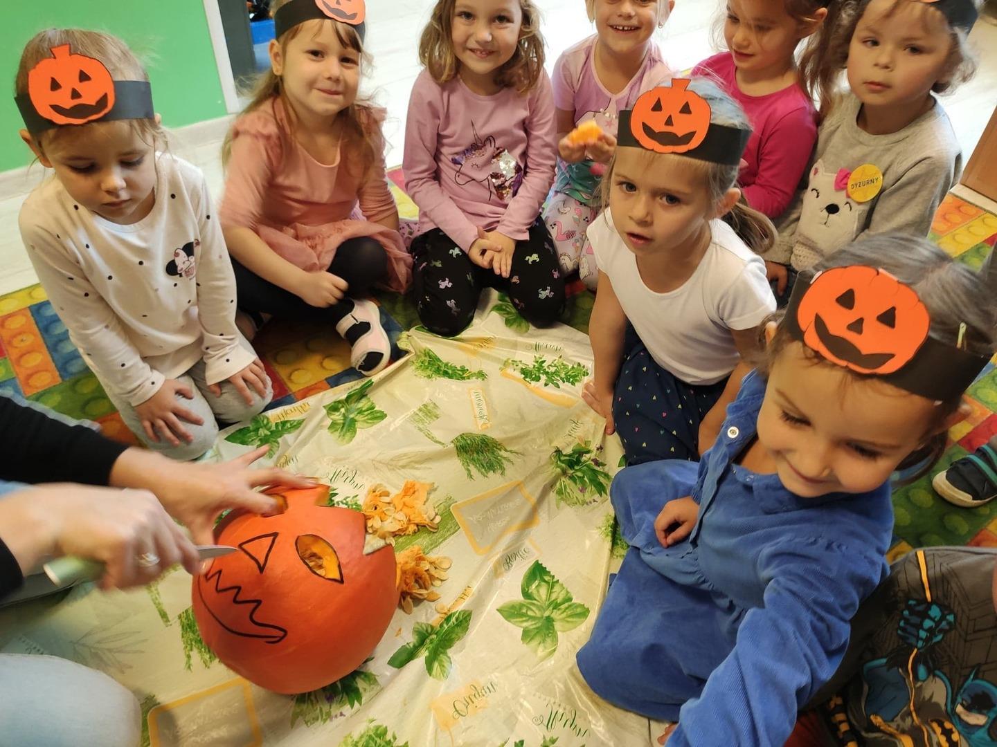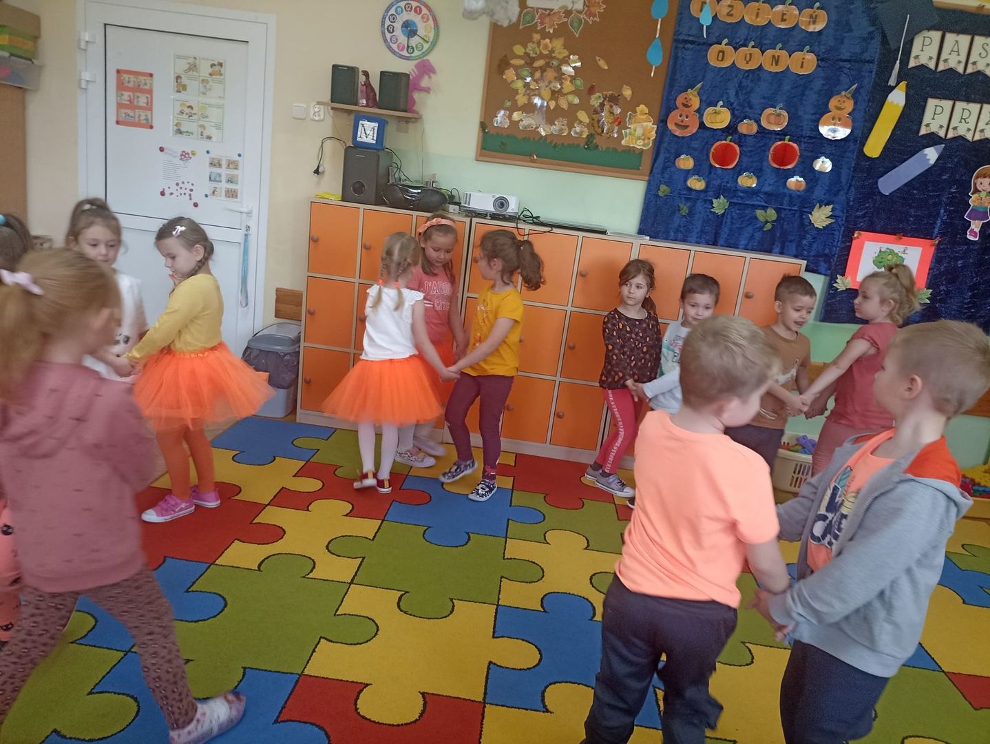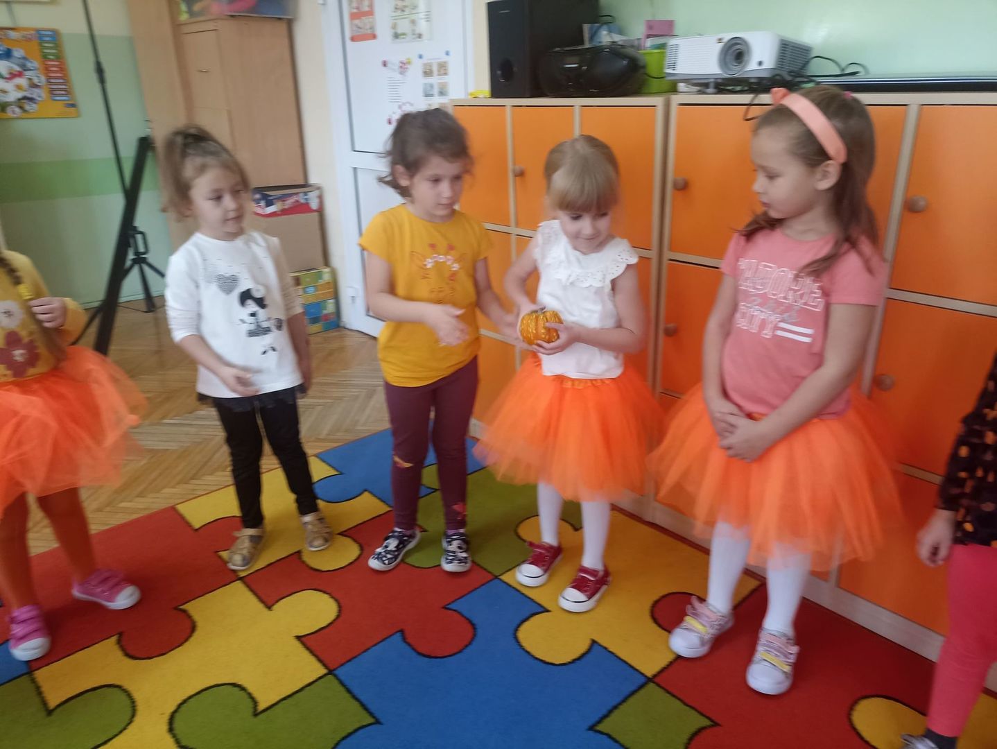 W naszym przedszkolu, jak co roku, nadchodzi taki czas, w którym wszelkie nasze działania kierujemy w stronę koloru pomarańczowego i 20.10 w czwartek obchodziliśmy „Dzień dyni”. Było u nas naprawdę „dyniowo”. Cały dzień przedszkolny, zajęcia edukacyjne, a nawet spożywanie posiłków, było związane z owym świętem. Przedszkolaki miały okazję poznać lub przypomnieć sobie o licznych zaletach dyni, sposobach jej wykorzystywania. W tym dniu wiele z naszych dzieci ubrane były w pomarańczowe ubranka. Przyniesione do przedszkola okazałe dynie, służyły dzieciom do sensorycznego poznania, a także do zabawy z wycinaniem różnych kształtów przy pomocy nauczyciela. Prace plastyczne tego dnia także upamiętniły obchodzone święto. Dzięki naszym wspaniałym paniom kucharkom mieliśmy okazję poznać dynię także pod względem smakowym i skosztować wspaniałego dyniowego ciasta oraz zupy dyniowej, co było wspaniałym zwieńczeniem „dyniowego dnia”.