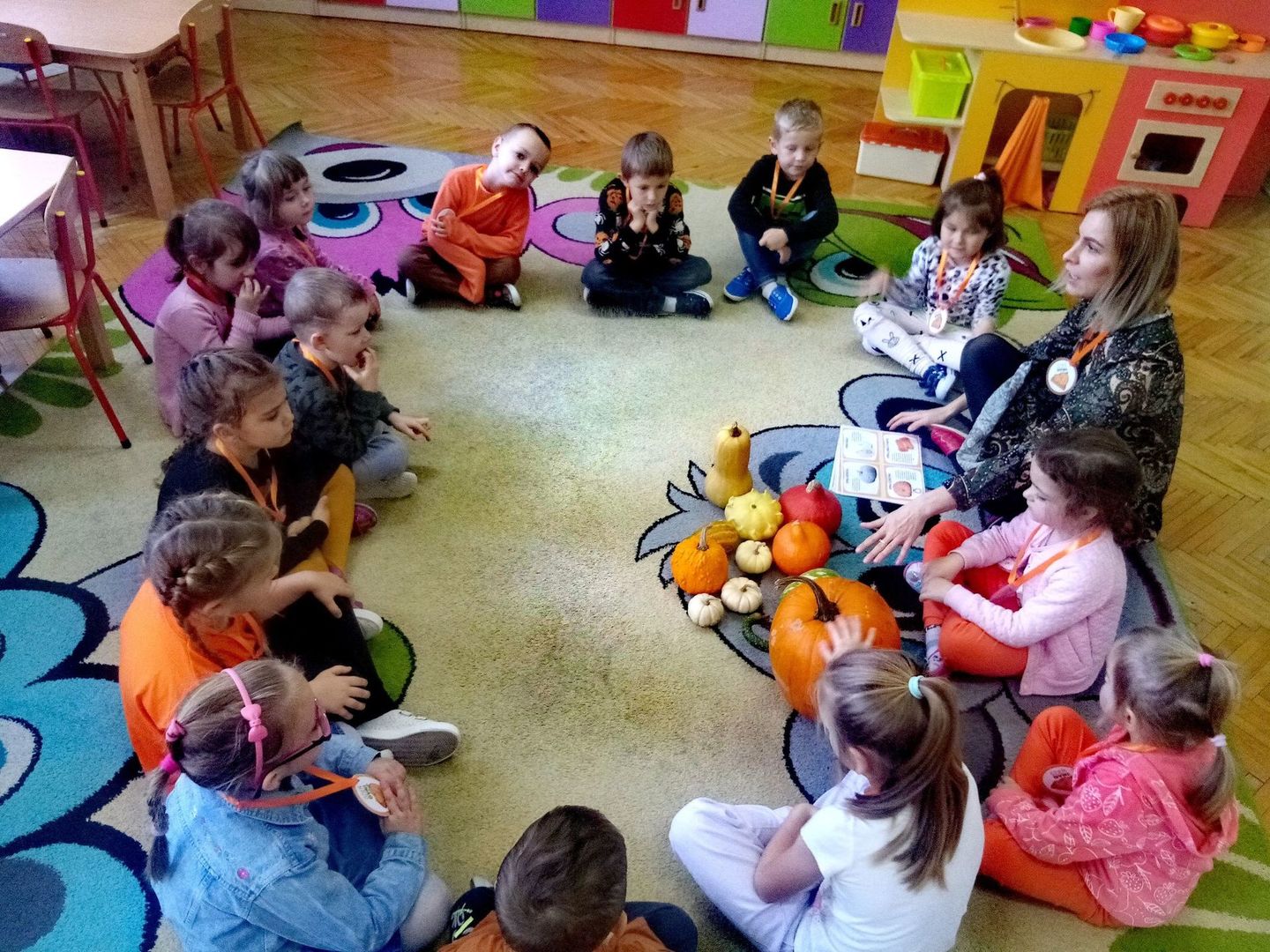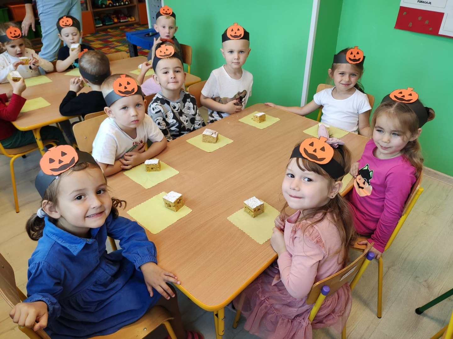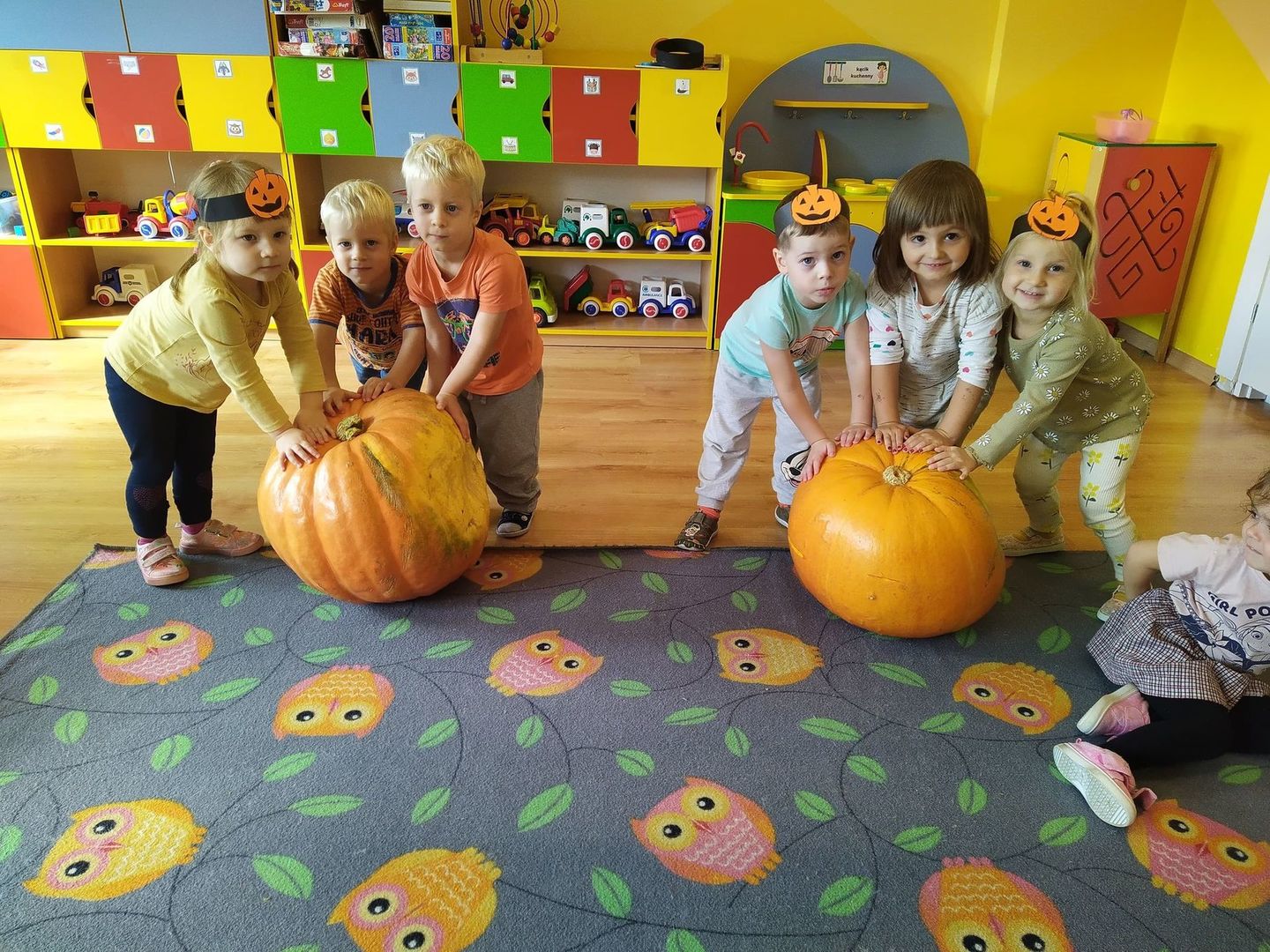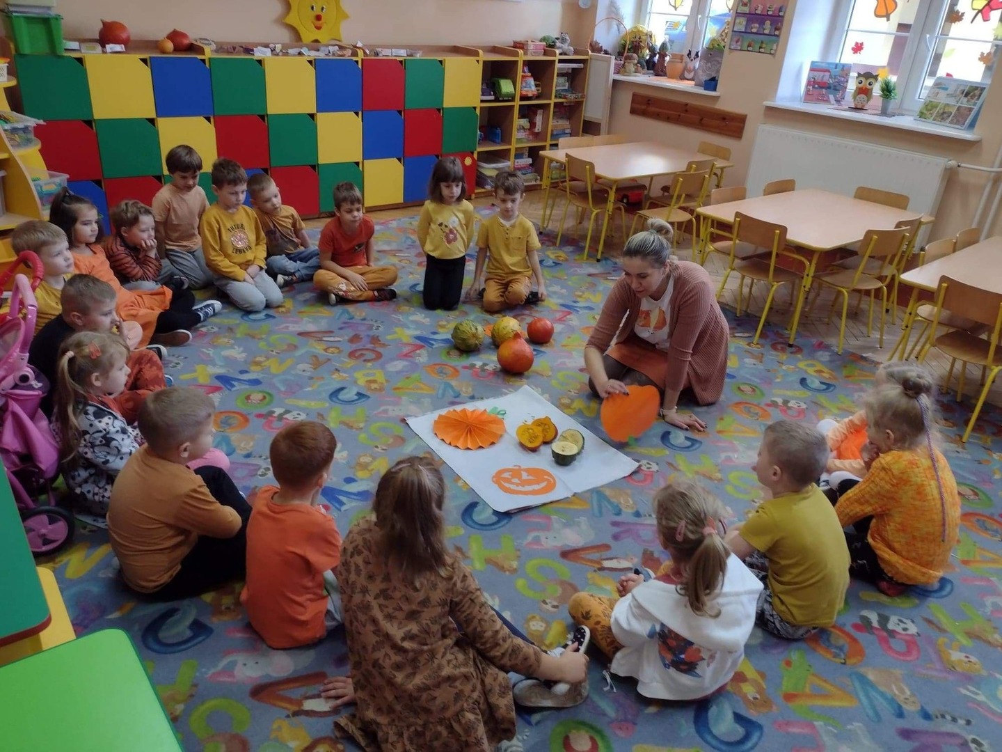 W naszym przedszkolu, jak co roku, nadchodzi taki czas, w którym wszelkie nasze działania kierujemy w stronę koloru pomarańczowego i 20.10 w czwartek obchodziliśmy „Dzień dyni”. Było u nas naprawdę „dyniowo”. Cały dzień przedszkolny, zajęcia edukacyjne, a nawet spożywanie posiłków, było związane z owym świętem. Przedszkolaki miały okazję poznać lub przypomnieć sobie o licznych zaletach dyni, sposobach jej wykorzystywania. W tym dniu wiele z naszych dzieci ubrane były w pomarańczowe ubranka. Przyniesione do przedszkola okazałe dynie, służyły dzieciom do sensorycznego poznania, a także do zabawy z wycinaniem różnych kształtów przy pomocy nauczyciela. Prace plastyczne tego dnia także upamiętniły obchodzone święto. Dzięki naszym wspaniałym paniom kucharkom mieliśmy okazję poznać dynię także pod względem smakowym i skosztować wspaniałego dyniowego ciasta oraz zupy dyniowej, co było wspaniałym zwieńczeniem „dyniowego dnia”.