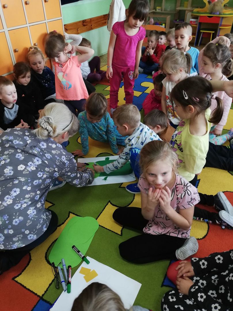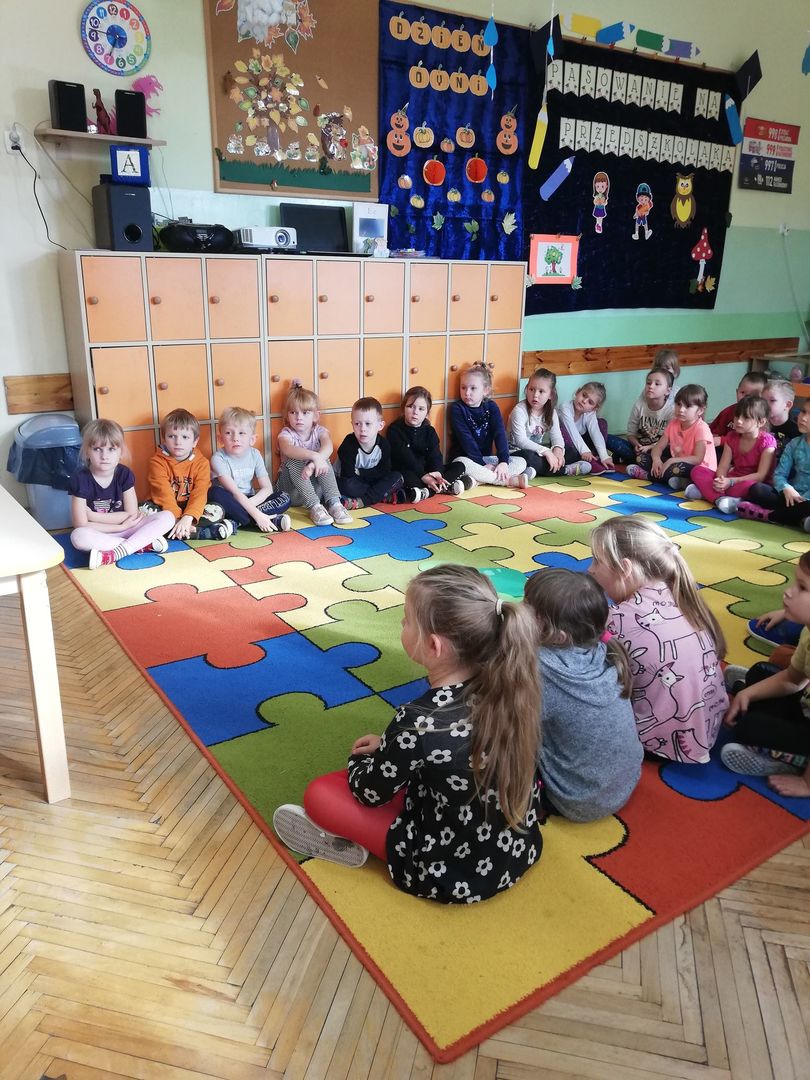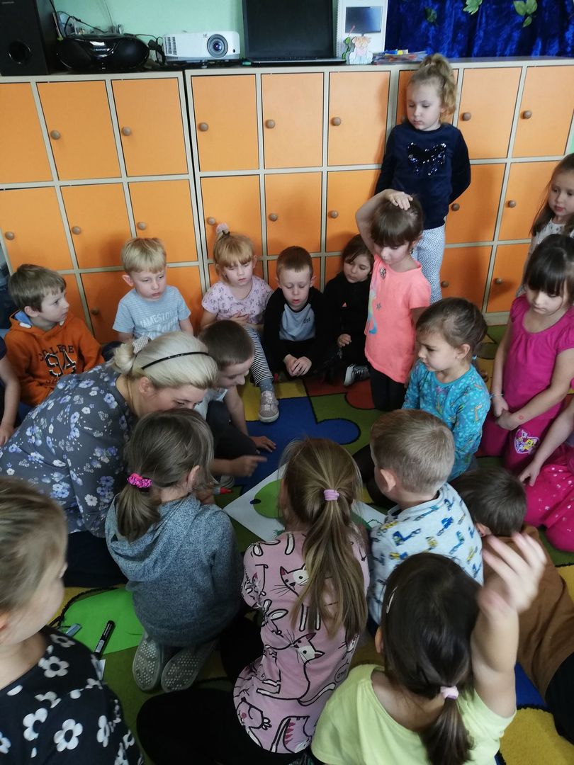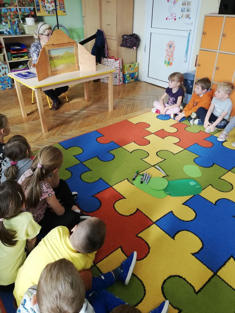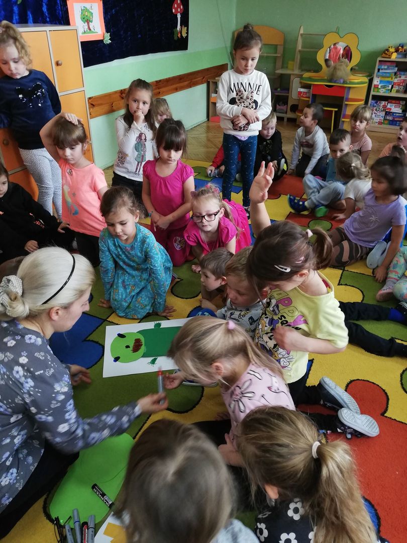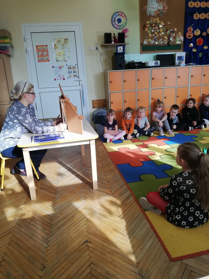 Dzieci z grup "Muchomorki" i "Smerfy" spotkały się 26. X. z panią Małgosią z MGBP w Iłży. Pani bibliotekarka zaprezentowala teatrzyk kamishibai " Bajka o Żabkach". Po jego obejrzeniu dzieci wykonywały różne zadania, kolorowały rysunki, ćwiczyły. Obcowały z literaturą przekazaną w ciekawej formie. Spotkanie przyczyniło się do rozwijania u dzieci wielu kompetencji kluczowych.