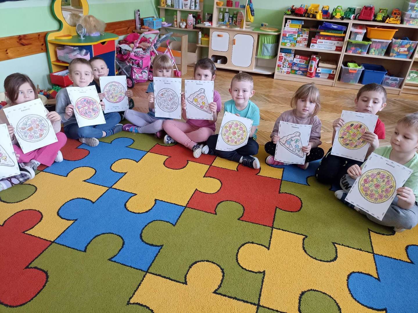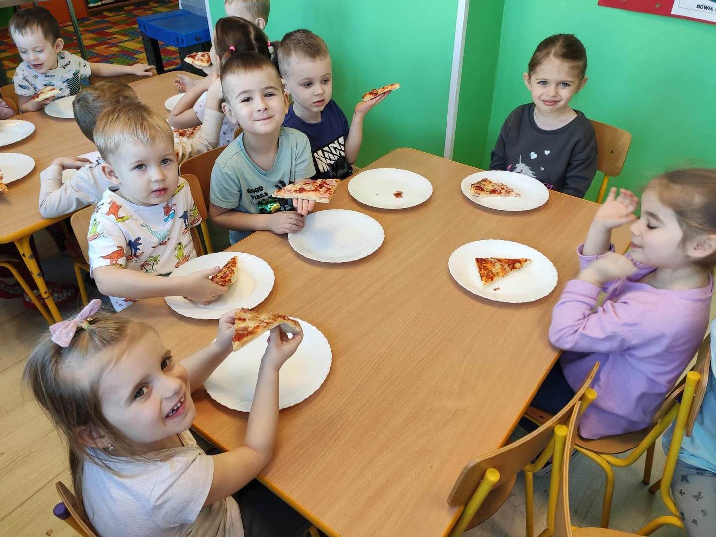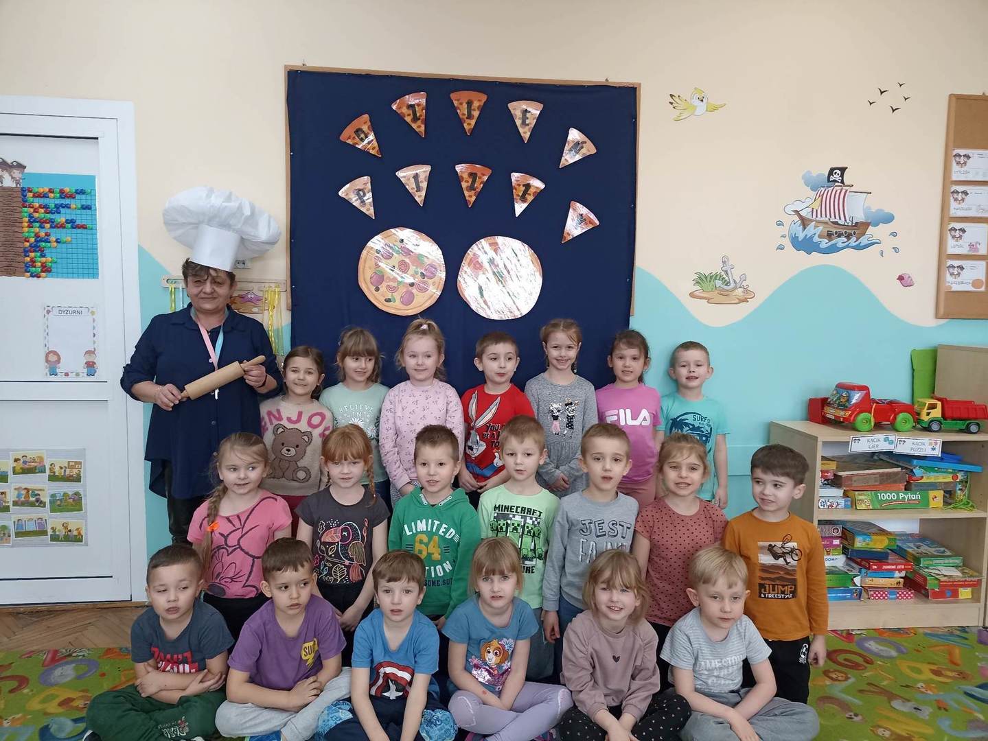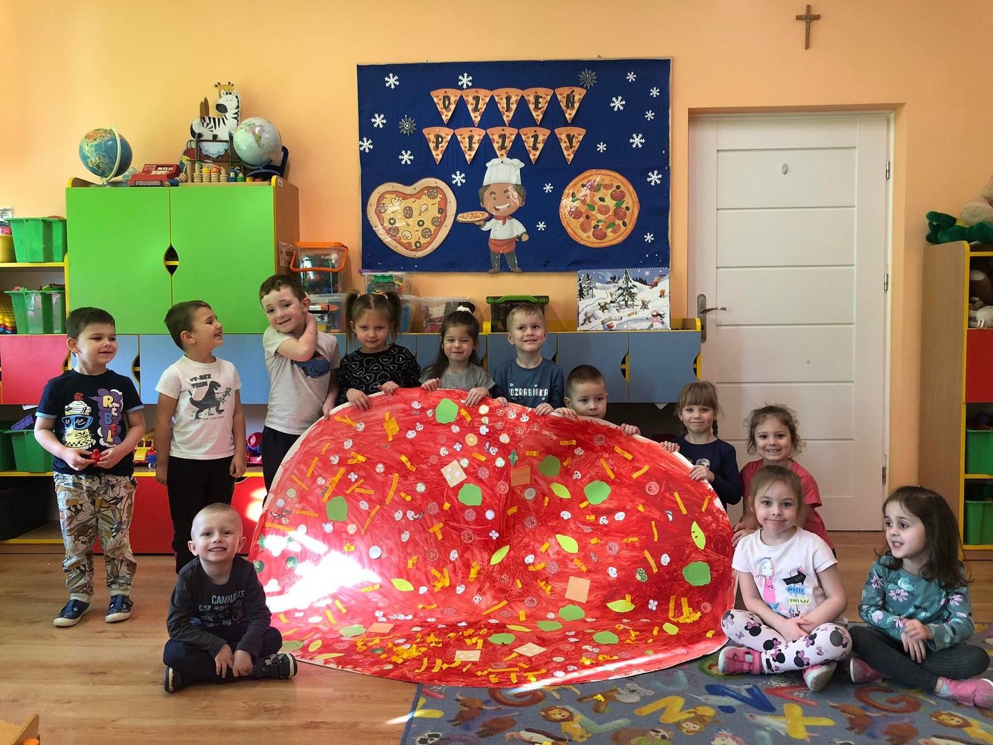 Jedną z najpopularniejszych potraw na świecie jest z pewnością pizza. Pizzę uwielbiają zarówno dorośli, jak też i dzieci, mając przy tym swoje ulubione rodzaje i składniki. 9 lutego wszystkie grupy przedszkolne świętowały Dzień Pizzy – był to oczywiście bardzo przyjemny dzień. W naszych salach zrobiło się iście „pizzowo” – mogliśmy zobaczyć piękne kolorowe dekoracje, dzieci wykonywały pizzę z papieru, plakaty, brały udział w zabawach o tejże tematyce, co wszystkich wprawiło w doskonałe humory. Nauczyciele wszelkie swoje działania skupili przede wszystkim na podkreśleniu zdrowego sposobu przyrządzenia pizzy, doboru odpowiednich składników i na tym, że pizza to danie, które też w pewien sposób łączy tradycje i pokolenia. Najmilszym zaskoczeniem okazała się pizza na drugie danie obiadowe, panie kucharki przyrządziły dzieciom przepyszną niespodziankę, która zniknęła z talerzy w mgnieniu oka