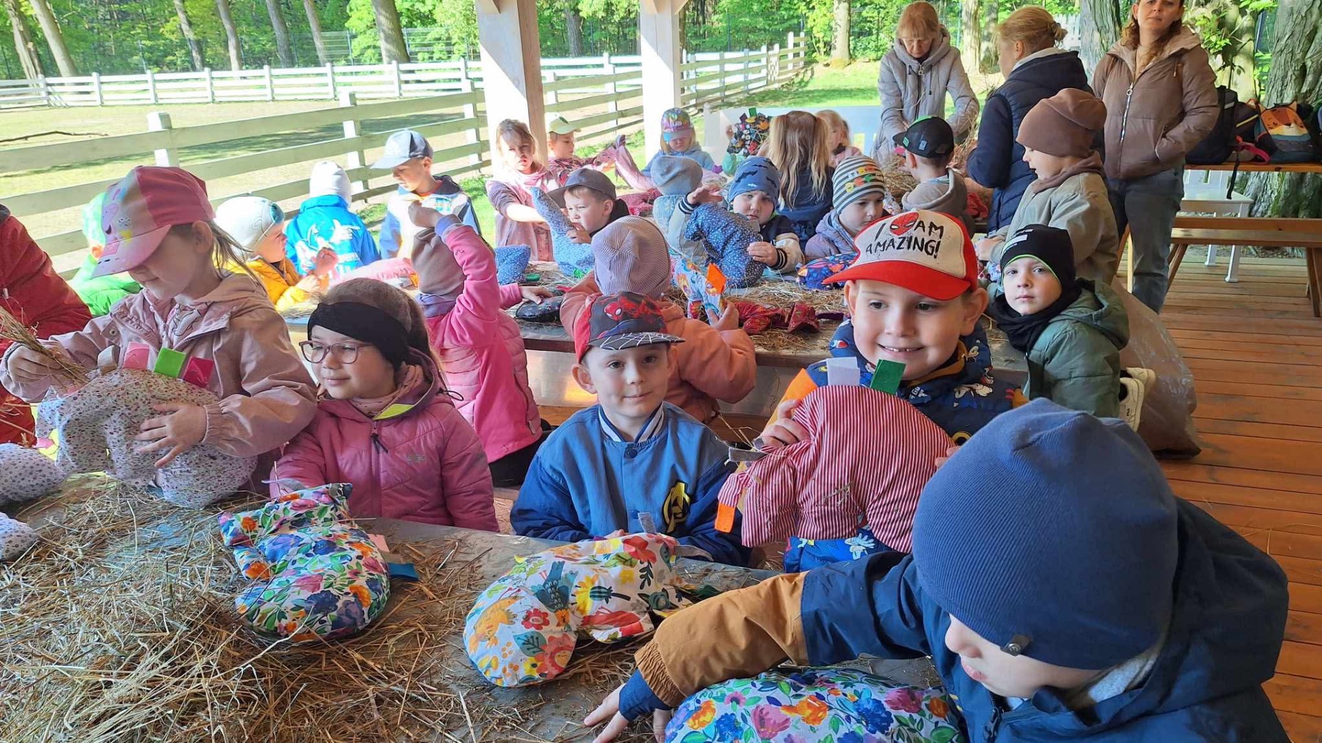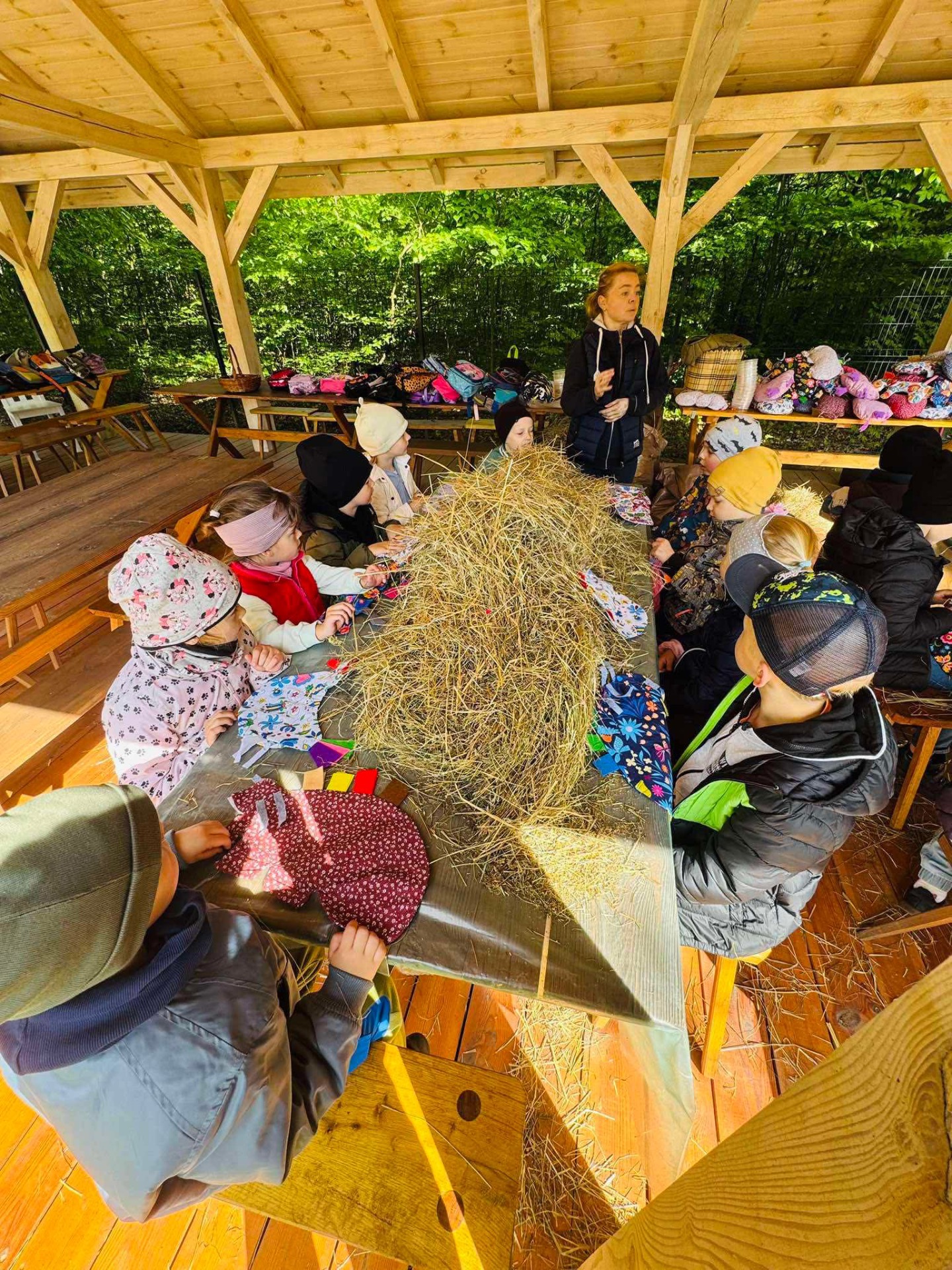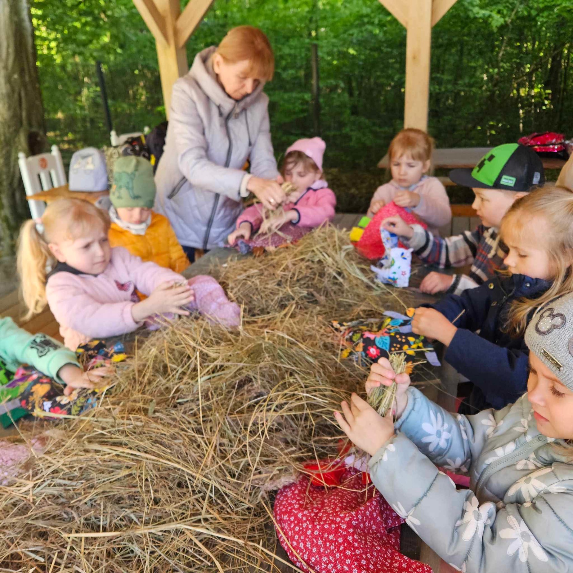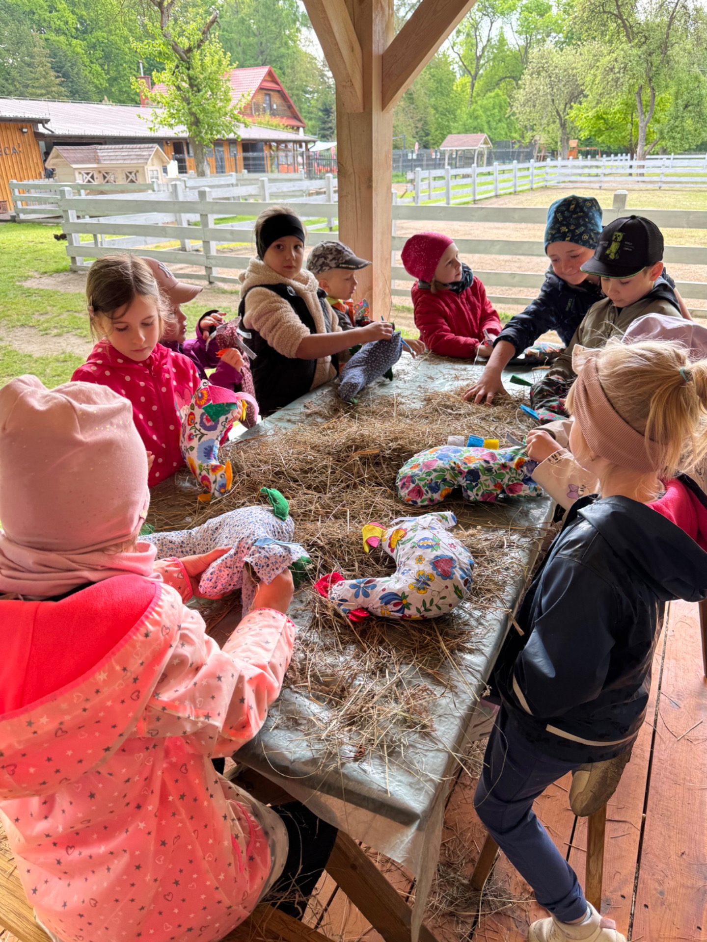 W ramach zajęć edukacyjnych przedszkolaki uczestniczyły także w warsztatach „Zabawka pachnąca sianem”. Dzieci z dużym zaangażowaniem wypychały zabawkę sianem oraz ozdabiały swoją pracę. Miały również możliwość uczestniczenia w plenerze malarskim i zabawach w ogródkach aktywnych.